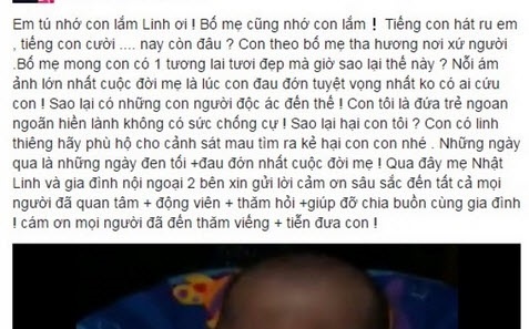 Trên Facebook, chị Nguyễn Thị Nguyên đăng status xúc động: "Em Tú nhớ con lắm Linh ơi! Bố mẹ cũng nhớ con lắm! Tiếng con hát ru em, tiếng con cười… nay còn đâu? Con theo bố mẹ tha hương nơi xứ người. Bố mẹ mong con có 1 tương lai tươi đẹp mà giờ sao lại thế này? Nỗi ám ảnh lớn nhất cuộc đời mẹ là lúc con đau đớn tuyệt vọng nhất không có ai cứu con. Sao lại có những con người độc ác đến thế! Con tôi là đứa trẻ ngoan ngoãn hiền lành không có sức chống cự. Sao lại hại con tôi? Con có linh thiêng hãy phù hộ cho cảnh sát mau tìm ra kẻ hại con con nhé! Những ngày qua là những ngày đen tối + đau đớn nhất cuộc đời mẹ. Qua đây, mẹ Nhật Linh và gia đình nội ngoại 2 bên xin gửi lời cảm ơn sâu sắc đến tất cả mọi người đã quan tâm + động viên + thăm hỏi + giúp đỡ chia buồn cùng gia đình. Cám ơn mọi người đã đến thăm viếng + tiễn đưa con".